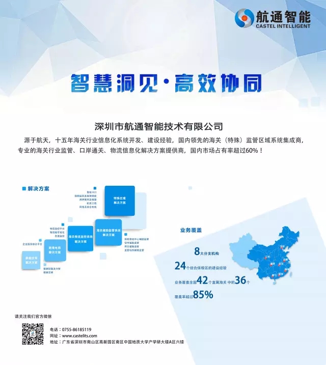 航通智能是國(guó)家級(jí)高新技術(shù)企業(yè)和雙軟認(rèn)證企業(yè),并獲得CMMI3資質(zhì)認(rèn)證。歷程十五載,航通智能已于海關(guān)行業(yè)監(jiān)管、口岸通關(guān)、保稅物流、加工貿(mào)易、物流信息化應(yīng)用集成領(lǐng)域在全國(guó)建設(shè)了數(shù)百個(gè)特殊監(jiān)管區(qū)與和監(jiān)管場(chǎng)所信息化系統(tǒng)。其中涉及云卡口、大數(shù)據(jù)風(fēng)險(xiǎn)分析、北斗/GPS監(jiān)控應(yīng)用、RFID射頻識(shí)別、移動(dòng)智能終端等應(yīng)用技術(shù)。業(yè)務(wù)覆蓋全國(guó)42個(gè)直屬海關(guān)中的36個(gè),關(guān)區(qū)覆蓋率超過(guò)85%,核心業(yè)務(wù)市場(chǎng)占有突破60%。