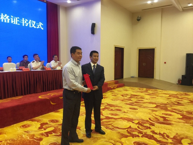 聯(lián)合驗收組組長、海關總署加貿(mào)司李志輝副司長向昆明綜合保稅區(qū)管委會專職副主任張宏頒發(fā)合格證書