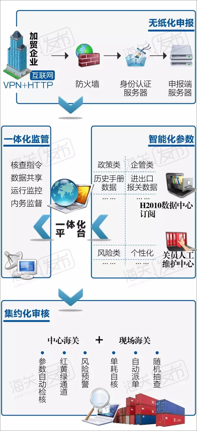 通過(guò)內(nèi)部的流程再造,以信息化手段實(shí)現(xiàn)加工貿(mào)易海關(guān)執(zhí)法作業(yè)的無(wú)紙化,以集中管理、專業(yè)審核實(shí)現(xiàn)集約化,以完善風(fēng)險(xiǎn)參數(shù)實(shí)現(xiàn)運(yùn)行監(jiān)控的智能化,通過(guò)信息互聯(lián)互通,相關(guān)部門(mén)廣泛參與、錯(cuò)位監(jiān)管、協(xié)同施力,最終實(shí)現(xiàn)加工貿(mào)易監(jiān)管的一體化。